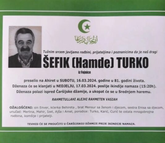 Na Ahiret je preselio ŠEFIK (Hamde) TURKO iz Fojnice